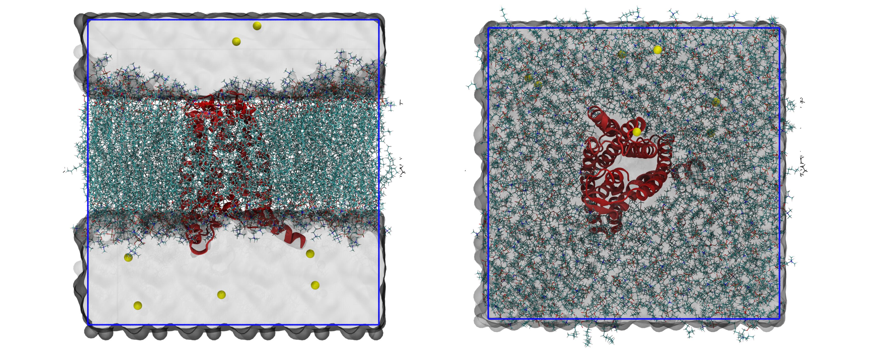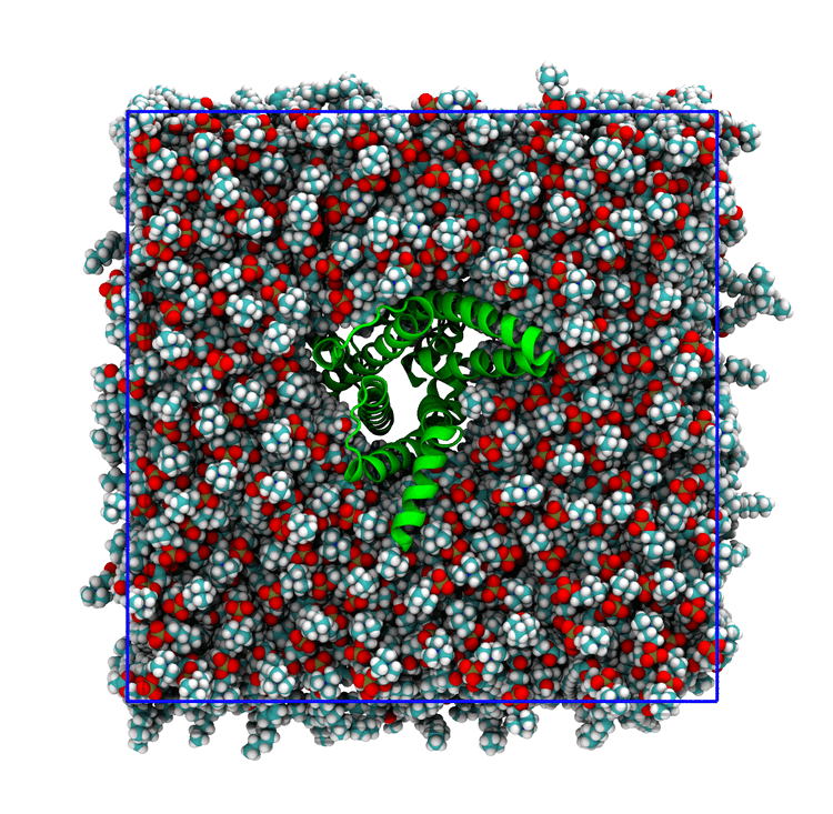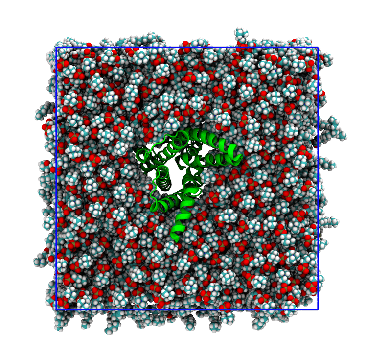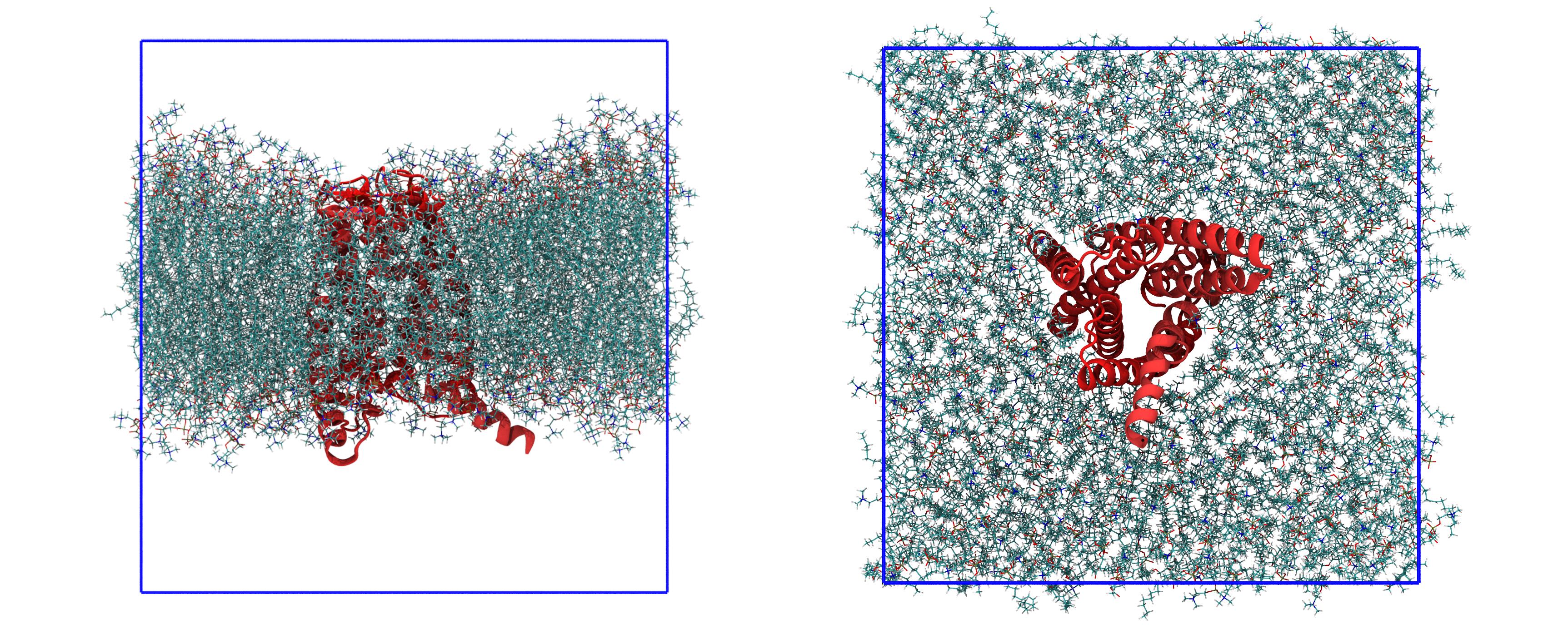 Nowadays, there are well-established procedures to embed proteins in lipid bilayer and thus properly simulate the (closest) physiological state of these system, arguably the most known being CHARMM-GUI webserver. Nevertheless, to better focus on how to set up the simulation box to get the simulations going and analyze data, the starting structure provided in this tutorial is already embedded in a mixed lipid bilayer of cholesterol and phosphatidylcholine (POPC), a common mixture for cell membrane simulations.