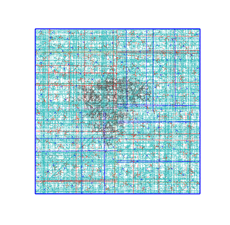 10.06535 10.06535 10.56089The meaning of the columns is the same as before. The last molecules to appear are the phopsholipids (and in fact, in the topology, they are reported last). The last line of a .gro file has, like the first two, a special meaning, as it reports the side length of the box along x, y, and z. For example, this box is roughly a cube, with x and y lengths of 10.06535 nm and z length of 10.56089 nm. Sometimes, for special types of boxes (like those used for the protein-ligand simulations), there might be more than three values reported. The starting configuration, which you can visualize with VMD, is reported in Figure 2.