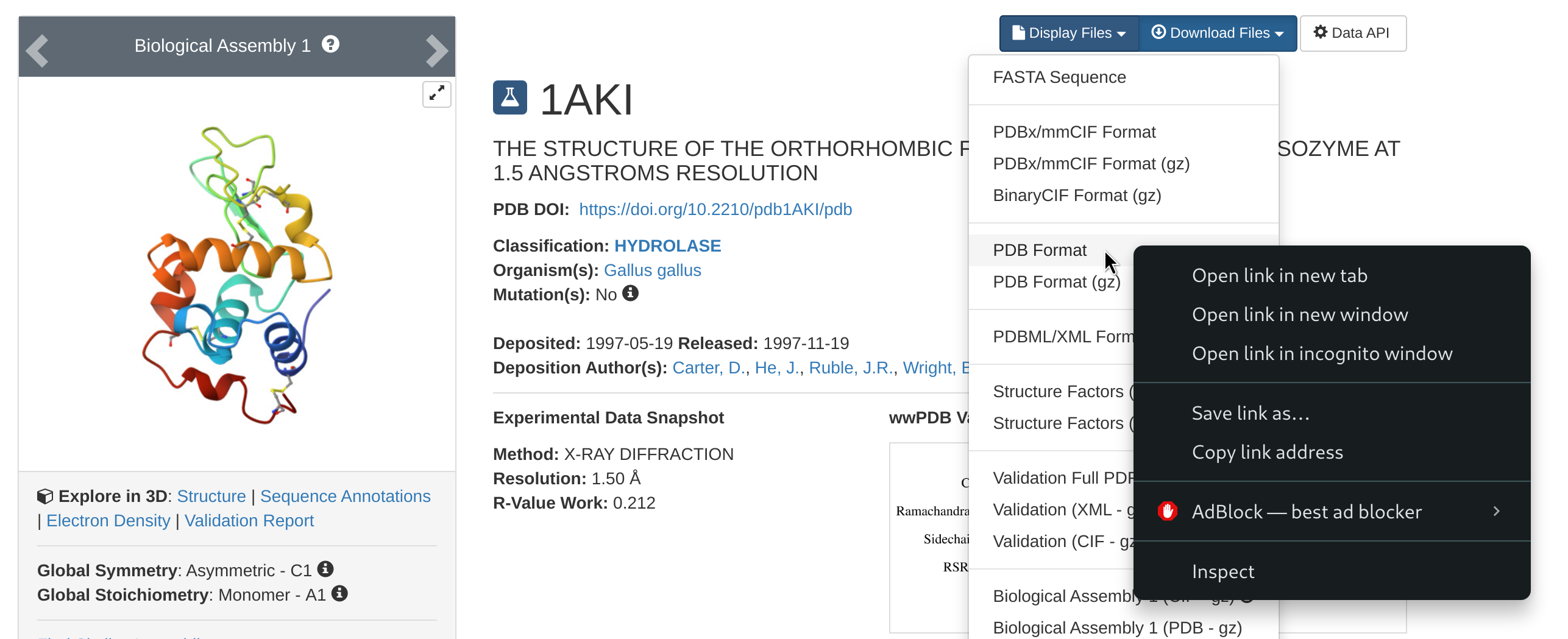 The first command is wget, and you will need it to download files from a web address. For example, at the beginning of the Lysozyme tutorial, you will be asked to go to the RCSB website and download the protein data bank file 1AKI.pdb. To do this, just follow the steps locally on your browser, but rather than downloading the file, right-click on the download option and copy the link address to that file.